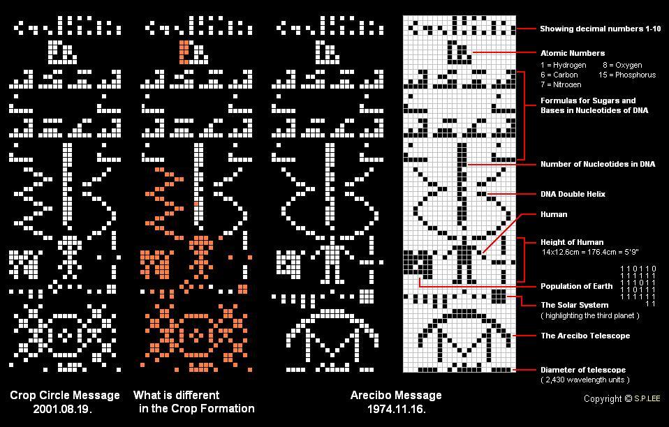 Спустя десятилетия, в августе 2001 года, рядом с обсерваторией Чилболтон в графстве Хэмпшир, Англия, произошло нечто удивительное. На пшеничном поле появился рисунок, подозрительно похожий на сообщение Аресибо, но с поразительными отличиями.